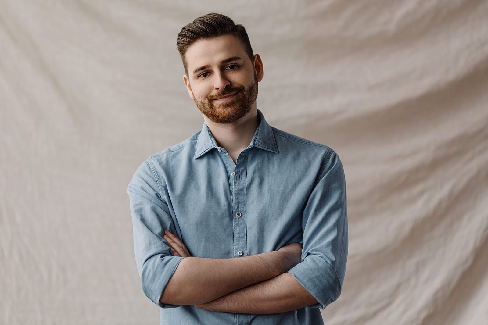 - Nowoczesny headshot z kolorem tła – najczęściej stosuję szary, niebieski, grafitowy lub delikatny pastel, który pozwala się nieco wyróżnić.