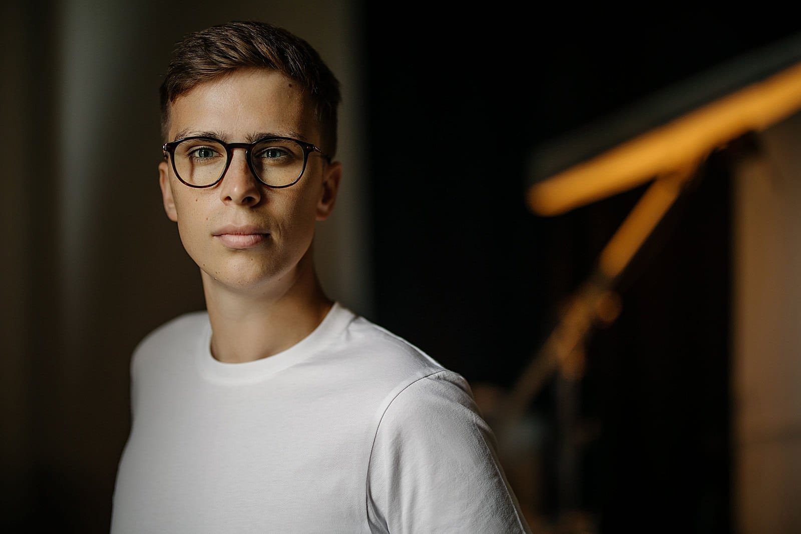 - Klasyczny portret w studio – neutralne tło, dobre światło, skupienie na twarzy modela.